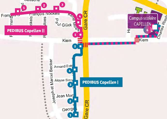 Le Pédibus est un système d'accompagnement des enfants à pied à l'école par des accompagnateurs embauchés par la commune. Les enfants attendent le Pédibus au point de ralliement convenu (arrêt) pour cheminer avec lui jusqu'à l'école. Sur le trajet du Pédibus, le logo du « Schoulwee » est visible sur le sol, et celui du Pédibus est affiché sur les arrêts de bus.